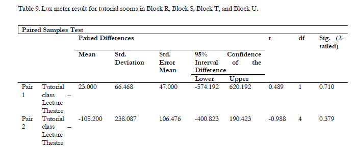 Even though artificial lighting is widely used nowadays, it has several negative impacts on human health. Therefore, this paper reported research that comparing the illuminance level in the learning environment in UTAR and recognizing the users’ insights on the illuminance level. Lux meter and questionnaires were used for data collection. Questionnaires were administered to 312 respondents. The results show that the illuminance level in some of the tutorial rooms is too bright and left on even when the rooms are empty. From the descriptive analysis, it is found that almost all the respondents are satisfied with the illuminance level in both research venues. Based on the t-test, it is found the significance for pair 1 and pair 2 is greater than 0.05. Hence, there is no similarity between both research venues. Pair 1 is about the lighting condition preferred by the respondents, while pair 2 is about the condition in both research venues which includes the existence of glaring vision, headache, eye tiredness, and conditions that affect student performance. This paper concludes by suggesting that individual switches be provided for each of the bulbs.
